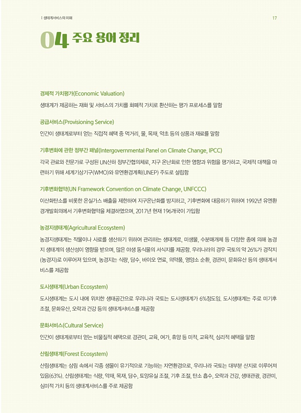 04 주요 용어 정리 경제적 가치평가 Economic Valuation 생태계가 제공하는 재화 및 서비스의 가치를 화폐적 가치로 환산하는 평가 프로세스를 말함 공급서비스 Provisioning Service 인간이 생태계로부터 얻는 직접적 혜택 중 먹거리, 물, 목재, 약초 등의 상품과 재료를 말함 기후변화에 관한 정부간 패널 Intergovernmental Panel on Climate Change, IPCC 각국 관료와 전문가로 구성된 UN산하 정부간협의체로, 지구 온난화로 인한 영향과 위험을 평가하고, 국제적 대책을 마 련하기 위해 세계기상기구 WMO 와 유엔환경계획 UNEP 주도로 설립함 기후변화협약 UN Framework Convention on Climate Change, UNFCCC 이산화탄소를...