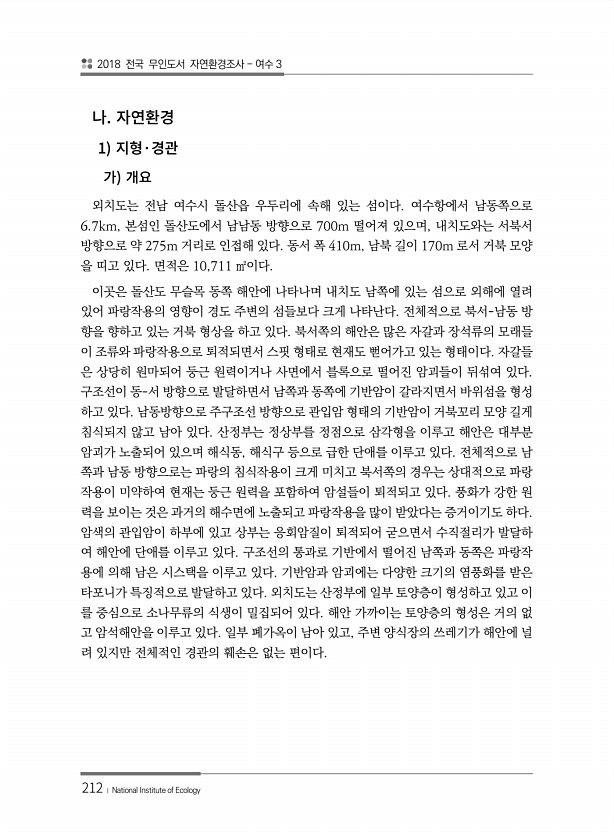 2018 전국 무인도서 자연환경조사 여수 3 212 ? National Institute of Ecology 1 · 외치도는 전남 여수시 돌산읍 우두리에 속해 있는 섬이다. 여수항에서 남동쪽으로 6.7km, 본섬인 돌산도에서 남남동 방향으로 700m 떨어져 있으며, 내치도와는 서북서 방향으로 약 275m 거리로 인접해 있다. 동서 폭 410m, 남북 길이 170m 로서 거북 모양 을 띠고 있다. 면적은 10,711 ㎡이다. 이곳은 돌산도 무슬목 동쪽 해안에 나타나며 내치도 남쪽에 있는 섬으로 외해에 열려 있어 파랑작용의 영향이 경도 주변의 섬들보다 크게 나타난다. 전체적으로 북서-남동 방 향을 향하고 있는 거북 형상을 하고 있다. 북서쪽의 해안은 많은 자갈과 장석류의 모래들 이 조류와 파랑작용으로 퇴적되면서...