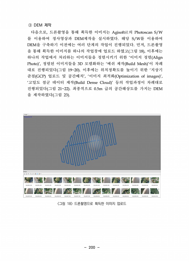 200 ③ DEM 제작 다음으로, 드론촬영을 통해 획득한 이미지는 Agisoft社의 Photoscan S/W 를 이용하여 정사영상과 DEM제작을 실시하였다. 해당 S/W를 이용하여 DEM을 구축하기 이전에는 여러 단계의 작업이 진행되었다. 먼저, 드론촬영 을 통해 획득한 이미지를 하나의 작업창에 업로드 하였고 그림 18 , 이후에는 하나의 작업에서 처리하는 이미지들을 정렬시키기 위한 ‘이미지 정렬 Align Photo ’, 정렬된 이미지들을 3D 모델화하는 ‘메쉬 제작 Build Mesh ’이 차례 대로 진행되었다 그림 1920 이후에는 위치정확도를 높이기 위한 ‘지상기 준점 GCP 업로드 및 공간배치’, ‘이미지 최적화 Optimization of images ’, ‘고밀도 점군 데이터 제작 Build D...