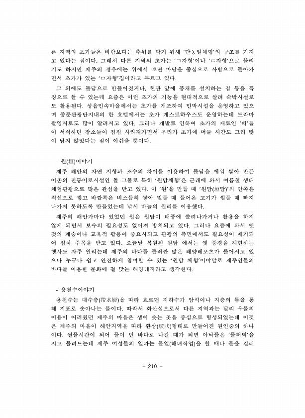 210 른 지역의 초가들은 바람보다는 추위를 막기 위해 단동일체형 의 구조를 가지 고 있다는 점이다 그래서 다른 지역의 초가는 자형 이나 자형 으로 불리 기도 하지만 제주의 경우에는 위에서 보면 마당을 중심으로 사방으로 돌아가 면서 초가가 있는 자형 집이라고 부르고 있다 그 외에도 돌담으로 만들어졌거나 현관 앞에 풍채를 설치하는 점 등을 특 징으로 들 수 있는데 요즘은 이런 초가의 기능을 현대적으로 살려 숙박시설로 도 활용된다 성읍민속마을에서는 초가를 개조하여 민박시설을 운영하고 있으 며 중문관광단지내의 한 호텔에서는 초가 게스트하우스도 운영하는데 드라마 촬영지로도 많이 알려지고 있다 그러나 개발로 인하여 초가의 재료인 띠 들 이 서식하던 장소들이 점점 사라져가면서 우리가 초가에 머물 시간도 그리 많 이 남...