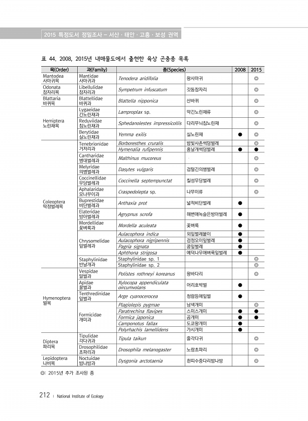 2015 특정도서 정밀조사 서산·태안·고흥·보성 권역 212 ? National Institute of Ecology 목 Order 과 Family 종 Species 2008 2015 Mantodea 사마귀목 Mantidae 사마귀과 Tenodera aridifolia 왕사마귀 ◎ Odonata 잠자리목 Libellulidae 잠자리과 Sympetrum infuscatum 깃동잠자리 ◎ Blattaria 바퀴목 Blattellidae 바퀴과 Blattella nipponica 산바퀴 ◎ Hemiptera 노린재목 Lygaeidae 긴노린재과 Lamproplax sp. 막긴노린재류 ◎ Reduviidae 침노린재과 Sphedanolestes impressicollis 다리무늬침노린재 ◎ Berytidae 실노...