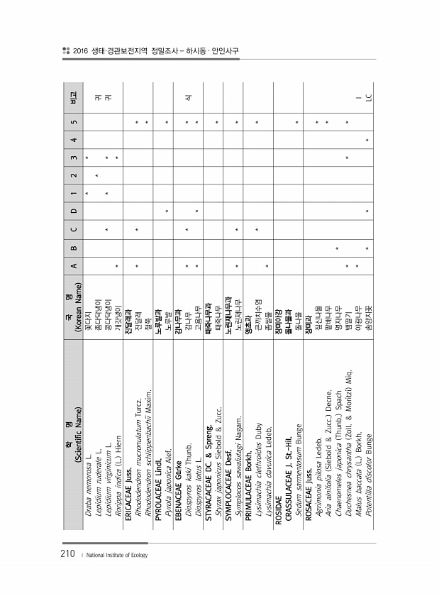 210 학 명 Scientific Name 국 명 Korean Name A B C D 1 2 3 4 5 비고 Draba nemorosa L. 꽃다지 * * Lepidium ruderale L. 좀다닥냉이 * 귀 Lepidium virginicum L. 콩다닥냉이 * * * 귀 Rorippa indica L. Hiern 개갓냉이 * * ERICACEAE Juss. 진달래과 Rhododendron mucronulatum Turcz. 진달래 * * * Rhododendron schlippenbachii Maxim. 철쭉 * PYROLACEAE Lindl. 노루발과 Pyrola japonica Alef. 노루발 * * EBENACEAE G?rke 감나무과 Diospyros kaki Thunb. 감나무 * * * 식...