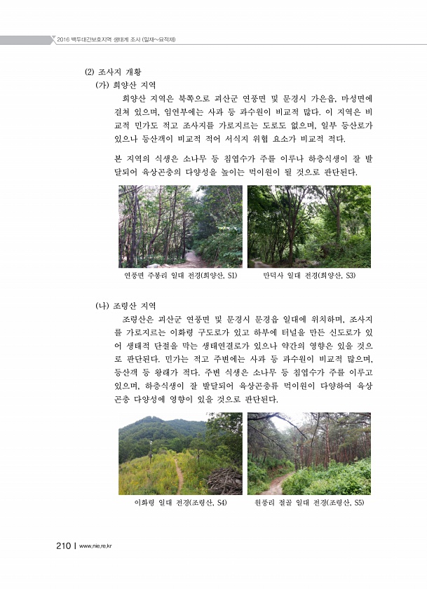 2016 백두대간보호지역 생태계 조사 밀재묘적재 210Ⅰwww.nie.re.kr 2 조사지 개황 가 희양산 지역 희양산 지역은 북쪽으로 괴산군 연풍면 및 문경시 가은읍, 마성면에 걸쳐 있으며, 임연부에는 사과 등 과수원이 비교적 많다. 이 지역은 비 교적 민가도 적고 조사지를 가로지르는 도로도 없으며, 일부 등산로가 있으나 등산객이 비교적 적어 서식지 위협 요소가 비교적 적다. 본 지역의 식생은 소나무 등 침엽수가 주를 이루나 하층식생이 잘 발 달되어 육상곤충의 다양성을 높이는 먹이원이 될 것으로 판단된다. 연풍면 주봉리 일대 전경 희양산, S1 만덕사 일대 전경 희양산, S3 나 조령산 지역 조령산은 괴산군 연풍면 및 문경시 문경읍 일대에 위치하며, 조사지 를 가로지르는 이화령 구도로가 있고 하부에 터널을...
