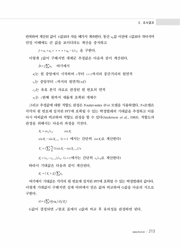 Ⅱ. 조사결과 www.nie.re.kr ? 213 반복하여 계산된 값이 값보다 작을 때가지 계속한다. 통산 ?값 이전에 값보다 작아지며 만일 이때에도 큰 값을 보이더라도 계산을 중지하고 ? ? ? ???? ? 을 구한다. 이렇게 ?값이 구해지면 개체군 추정값은 다음과 같이 계산된다. ??? 여기에서 ? ?는 원 중앙에서 시작하여 ?부터 ?까지의 중간거리의 원면적 ? ?는 중앙부터 ?까지의 원면적 ?? ? 는 유효 분석 자료로 판정된 원 번호의 면적 ?? 는 ?번째 원까지 새롭게 포획된 개체수 그리고 추정값에 대한 적합도 판정은 Fourier-series F-s 모델을 사용하였다. F-s모델은 각각의 원 번호에 설치된 PFT에 포획될 수 있는 딱정벌레의 기대값을...