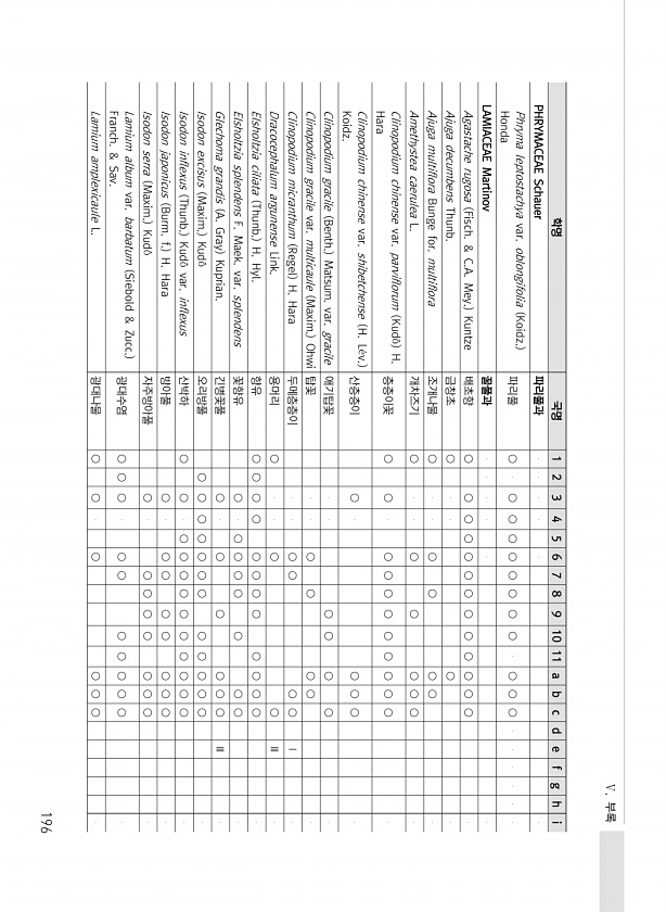 Ⅴ. 부록 196 학명 국명 1 2 3 4 5 6 7 8 9 10 11 a b c d e f g h i PHRYMACEAE Schauer 파리풀과 Phryma leptostachya var. oblongifolia Koidz. Honda 파리풀 ○ ○ ○ ○ ○ ○ ○ ○ ○ ○ ○ ○ LAMIACEAE Martinov 꿀풀과 Agastache rugosa Fisch. & C.A. Mey. Kuntze 배초향 ○ ○ ○ ○ ○ ○ ○ ○ ○ ○ ○ ○ ○ Ajuga decumbens Thunb. 금창초 ○ ○ Ajuga multiflora Bunge for. multiflora 조개나물 ○ ○ ○ ○ ○ Amethystea caerulea L. 개차즈기 ○ ○ ○ ○ ○ ○ Clinopodium chinen...