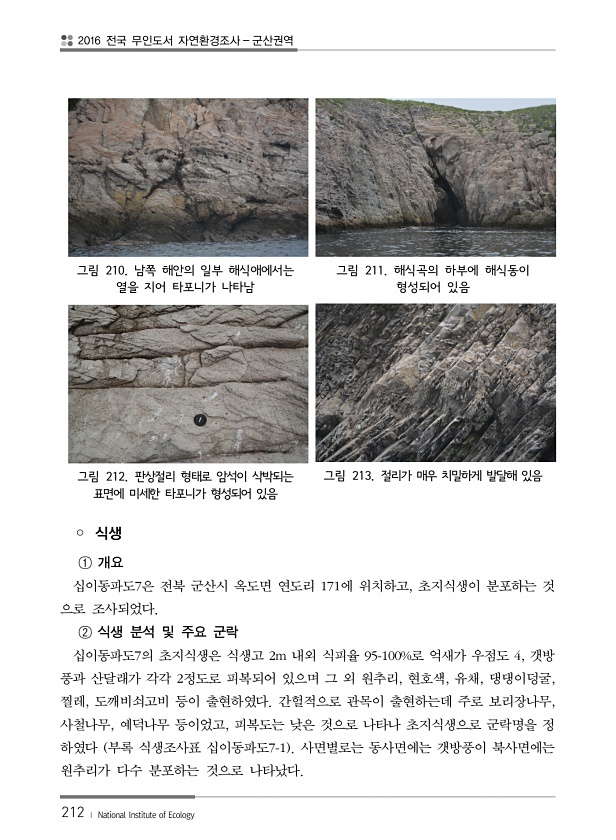 2016 전국 무인도서 자연환경조사 군산권역 212 ? National Institute of Ecology 그림 210. 남쪽 해안의 일부 해식애에서는 열을 지어 타포니가 나타남 그림 211. 해식곡의 하부에 해식동이 형성되어 있음 그림 212. 판상절리 형태로 암석이 삭박되는 표면에 미세한 타포니가 형성되어 있음 그림 213. 절리가 매우 치밀하게 발달해 있음 ? 식생 ① 개요 십이동파도7은 전북 군산시 옥도면 연도리 171에 위치하고, 초지식생이 분포하는 것 으로 조사되었다. ② 식생 분석 및 주요 군락 십이동파도7의 초지식생은 식생고 2m 내외 식피율 95-100%로 억새가 우점도 4, 갯방 풍과 산달래가 각각 2정도로 피복되어 있으며 그 외 원추리, 현호색, 유채, 댕댕이덩굴, 찔레, 도깨비쇠고비 ...
