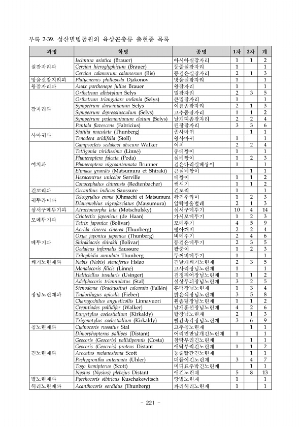 212 ? National Institute of Ecology 학명 국명 1차 2차 3차 4차 St.1 St.2 St.3 St.4 St.5 St.6 St.7 St.8 St.1 St.2 St.3 St.4 St.5 St.6 St.7 St.8 St.1 St.2 St.3 St.4 St.5 St.6 St.7 St.8 St.1 St.2 St.3 St.4 St.5 St.6 St.7 St.8 Plateumaris Euplateumaris sericea sibirica 넓적뿌리잎벌레 1 Pyrrhalta maculicollis Pyrrhalta luteola 띠띤수염잎벌레 1 1 1 Thlaspida lewisii 루이스큰남생이잎벌레 1 Family Cleridae 개미붙이과 Clerus dealbatus 참개미붙이 1 ...