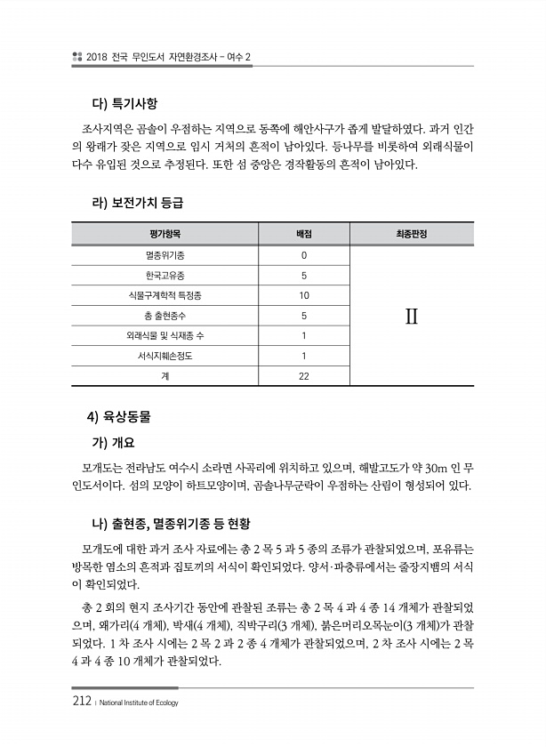 2018 전국 무인도서 자연환경조사 여수 2 212 ? National Institute of Ecology 조사지역은 곰솔이 우점하는 지역으로 동쪽에 해안사구가 좁게 발달하였다. 과거 인간 의 왕래가 잦은 지역으로 임시 거처의 흔적이 남아있다. 등나무를 비롯하여 외래식물이 다수 유입된 것으로 추정된다. 또한 섬 중앙은 경작활동의 흔적이 남아있다. 평가항목 배점 최종판정 멸종위기종 0 Ⅱ 한국고유종 5 식물구계학적 특정종 10 총 출현종수 5 외래식물 및 식재종 수 1 서식지훼손정도 1 계 22 4 모개도는 전라남도 여수시 소라면 사곡리에 위치하고 있으며, 해발고도가 약 30m 인 무 인도서이다. 섬의 모양이 하트모양이며, 곰솔나무군락이 우점하는 산림이 형성되어 있다. , 모개도에 대한 과거 조사 자료에는 ...