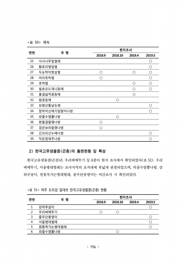 196 연번 국 명 현지조사 2018.9 2018.10 2019.4 2019.5 25 사시나무잎벌레 ○ 26 황호리병잎벌 ○ 27 두눈박이쌍살벌 ○ ○ ○ 28 어리호박벌 ○ ○ 29 호박벌 ○ ○ 30 빌로오드재니등에 ○ ○ 31 물결넓적꽃등에 ○ 32 왕꽃등에 ○ 33 묘향산통날도래 ○ 34 점박이산애기잎말이나방 ○ 35 외줄수염뿔나방 ○ 36 흰물결물명나방 ○ 37 검은보라들명나방 ○ 38 긴꼬리산누에나방 ○ 39 작은점재주나방 ○ 50 표 계속 한국고유생물종 곤충 은 우리벼메뚜기 등 종이 현지 조사에서 확인되었다 표 우리 6 51 벼메뚜기 서울병대벌레는 조사지역의 초지대에 폭넓게 관찰되었으며 외줄수염뿔나방 강 , , , 하루살이 원통목가는병대벌레 줄우단풍뎅이는 야간조사 시 확인되었다 , , 연번 국 ...