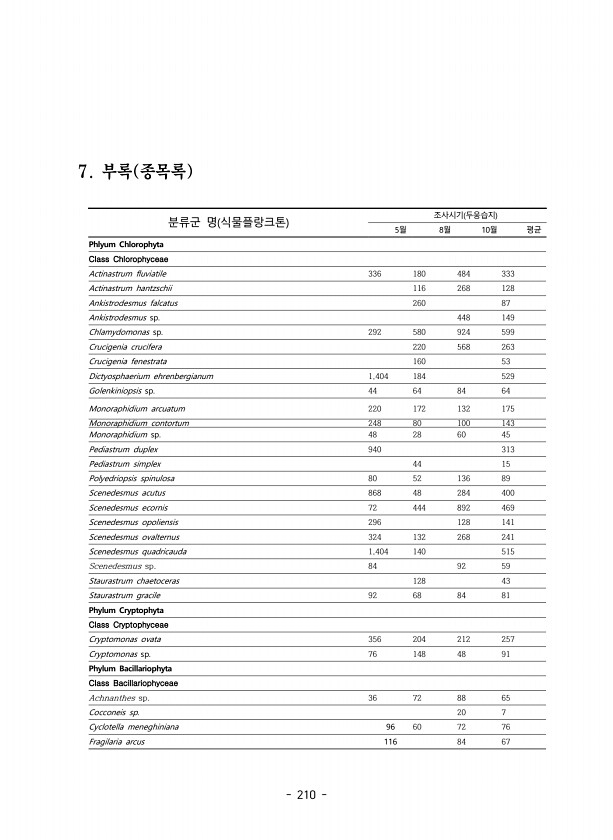 210 7. 부록 종목록 분류군 명 식물플랑크톤 조사시기 두웅습지 5월 8월 10월 평균 Phlyum Chlorophyta Class Chlorophyceae Actinastrum fluviatile 336 180 484 333 Actinastrum hantzschii 116 268 128 Ankistrodesmus falcatus 260 87 Ankistrodesmus sp. 448 149 Chlamydomonas sp. 292 580 924 599 Crucigenia crucifera 220 568 263 Crucigenia fenestrata 160 53 Dictyosphaerium ehrenbergianum 1,404 184 529 Golenkiniopsis sp. 44 64 84 64 Monorap...