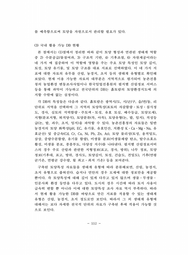 552 를 예측함으로써 토양을 자원으로서 관리할 필요가 있다. 3 국내 활용 가능 DB 현황 본 절에서는 1 절에서 정리한 바와 같이 토양 형성과 연관된 생태계 역할 중 2 수분공급/물질여과, 3 구조적 기반, 4 기후조절, 6 자원제공이라는 네 가지 에 집중하여 이 역할에 영향을 주는 주요 토양 특성인 토양 깊이, 토성, 토양 유기물, 및 토양 구조를 대표 지표로 선택하였다. 이 네 가지 지 표에 대한 자료의 유무를 산림, 농경지, 초지 등의 생태계 유형별로 확인해 보았다. 현재 이용 가능한 자료의 대부분은 지역적으로 평가되어 농촌진흥 청의 농업환경 변동조사사업이나 한국임업진흥원의 필지별 산림정보 서비스 등을 통해 파악이 가능하고 전국단위의 DB는 흙토람의 토양환경지도에 의 지할 수밖에 없는 실정이다. 각...