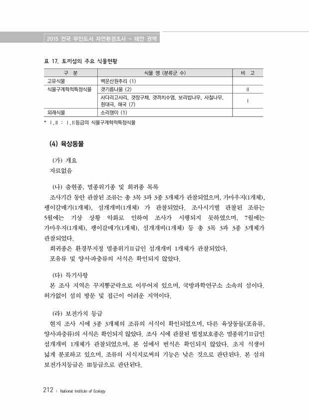 2015 전국 무인도서 자연환경조사 태안 권역 212 ? National Institute of Ecology 구 분 식물 명 분류군 수 비 고 고유식물 백운산원추리 1 식물구계학적특정식물 갯기름나물 2 Ⅱ 사다리고사리, 갯장구채, 갯까치수염, 보리밥나무, 사철나무, 흰대극, 해국 7 Ⅰ 외래식물 소리쟁이 1 표 17. 토끼섬의 주요 식물현황 * Ⅰ,Ⅱ Ⅰ,Ⅱ등급의 식물구계학적특정식물 4 육상동물 가 개요 자료없음 나 출현종, 멸종위기종 및 희귀종 목록 조사기간 동안 관찰된 조류는 총 3목 3과 3종 3개체가 관찰되었으며, 가마우지 1개체 , 괭이갈매기 1개체 , 섬개개비 1개체 가 관찰되었다. 조사시기별 관찰된 조류는 5월에는 기상 상황 악화로 인하여 조사가 시행되지 못하였으며, 7월에는 가마우지 1개체 ...