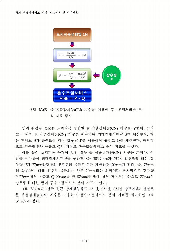 국가 생태계서비스 평가 지표선정 및 평가적용 194 그림 Ⅳ-65. 물 유출잠재능 CN 지수를 이용한 홍수조절서비스 분 석 지표 평가 먼저 환경부 중분류 토지피복 유형별 물 유출잠재능 CN 지수를 구한다. 그리 고 구해진 물 유출잠재능 CN 지수를 이용하여 최대잠재저류량 S를 계산한다. 다 음 단계로 S와 홍수조절 대상 강우량 P를 이용하여 유출고 Q를 계산한다. 마지막 으로 강우량 P와 유출고 Q의 차이로 홍수조절서비스 분석 지표를 구한다. 예를 들어 토지피복 유형이 밭인 경우 물 유출잠재능 CN 지수는 71이다. 이 값을 이용하여 최대잠재저류량을 구하면 S는 103.7mm가 된다. 홍수조절 대상 강 우량 P가 77mm라면 S와 P로부터 유출고 Q를 계산하면 20mm가 된다. 즉, 77mm 의 강우량에 대...