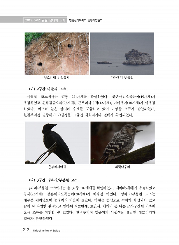2015 DMZ 일원 생태계 조사 민통선이북지역 동부해안권역 212 ? National Institute of Ecology 청호반새 번식둥지 가마우지 번식섬 나 2구간 마달리 코스 마달리 코스에서는 37종 221개체를 확인하였다. 붉은머리오목눈이 45개체 가 우점하였고 흰뺨검둥오리 23개체 , 큰부리까마귀 12개체 , 가마우지 10개체 가 아우점 하였다. 비교적 얕은 산지와 수계를 포함하고 있어 다양한 조류가 관찰되었다. 환경부지정 멸종위기 야생생물 Ⅱ급인 새호리기와 벌매가 확인되었다. 큰부리까마귀 쇠딱다구리 다 3구간 명파리/부봉천 코스 명파리/부봉천 코스에서는 총 37종 207개체를 확인하였다. 제비 65개체 가 우점하였고 참새 22개체 , 붉은머리오목눈이 20개체 가 아우점 하였다. 명파리/부봉천 코...