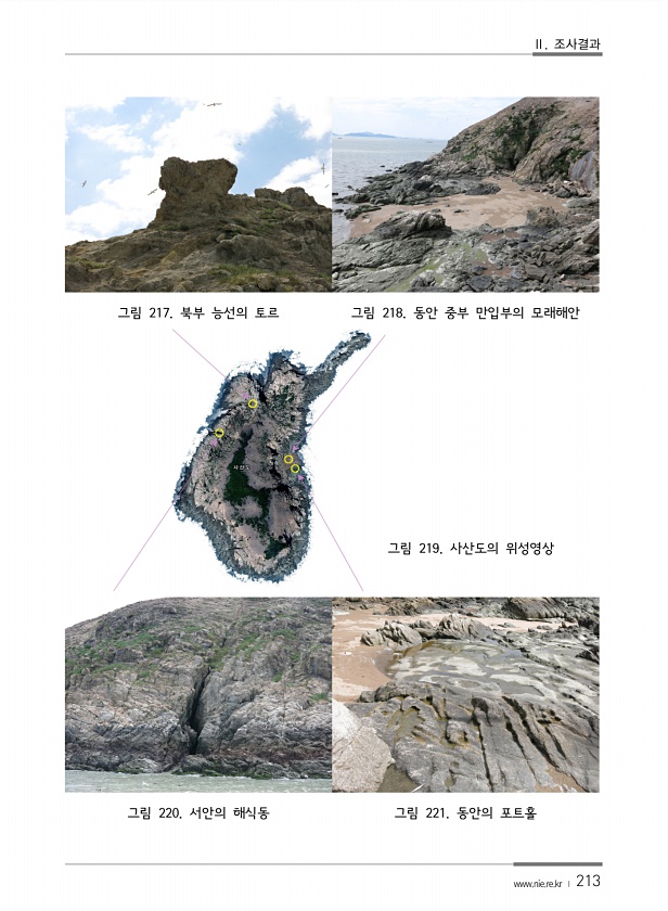 Ⅱ. 조사결과 www.nie.re.kr ? 213 그림 217. 북부 능선의 토르 그림 218. 동안 중부 만입부의 모래해안 그림 219. 사산도의 위성영상 그림 220. 서안의 해식동 그림 221. 동안의포트홀