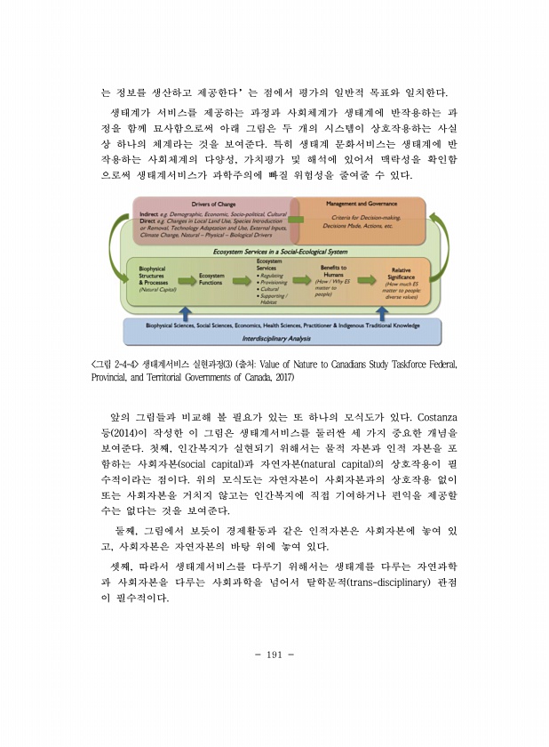 191 는 정보를 생산하고 제공한다’는 점에서 평가의 일반적 목표와 일치한다. 생태계가 서비스를 제공하는 과정과 사회체계가 생태계에 반작용하는 과 정을 함께 묘사함으로써 아래 그림은 두 개의 시스템이 상호작용하는 사실 상 하나의 체계라는 것을 보여준다. 특히 생태계 문화서비스는 생태계에 반 작용하는 사회체계의 다양성, 가치평가 및 해석에 있어서 맥락성을 확인함 으로써 생태계서비스가 과학주의에 빠질 위험성을 줄여줄 수 있다. 그림 2-4-4 생태계서비스 실현과정 3 출처Value of Nature to Canadians Study Taskforce Federal, Provincial, and Territorial Governments of Canada, 2017 앞의 그림들과 비교해 볼 필요가 있는 또 하나의...