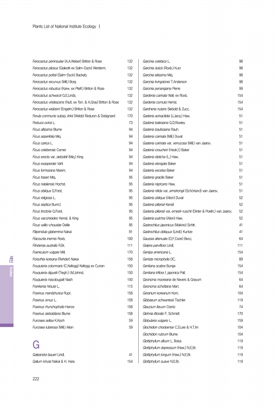 222 색인 Index Plants List of National Institute Ecology Ⅰ Ferocactus peninsulae A.A.Weber Britton & Rose 132 Ferocactus pilosus Galeotti ex Salm-Dyck Werderm. 132 Ferocactus pottsii Salm-Dyck Backeb. 132 Ferocactus recurvus Mill. Borg 132 Ferocactus robustus Karw. ex Pfeiff. Britton & Rose 132 Ferocactus schwarzii G.E.Linds. 132 Ferocactus viridescens Nutt. ex Torr. & A.Gray Britton & Rose 132 Fero...