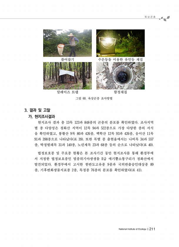 육 상 곤 충 National Institute of EcologyⅠ211 쓸어잡기 수은등을 이용한 유인등 채집 말레이즈 트랩 함정채집 그림 60. 육상곤충 조사방법 3. 결과 및 고찰 가. 현지조사결과 현지조사 결과 총 13목 123과 848종의 곤충의 분포를 확인하였다. 조사지역 별 종 다양성은 청화산 지역이 12목 94과 522종으로 가장 다양한 종의 서식 을 확인하였고, 봉황산 9목 80과 426종, 백학산 12목 93과 426종, 웅이산 11목 91과 398종으로 나타났다 표 39 또한 목별 종 출현율에서는 나비목 34과 557 종, 딱정벌레목 31과 140종, 노린재목 23과 68종 등의 순으로 나타났다 표 40 법정보호종 및 주요종 현황은 본 조사기간 동안 현지조사를 통해 환경부에 서 지정한 법...