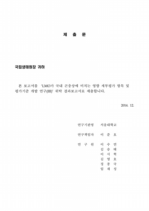 제 출 문 국립생태원장 귀하 본 보고서를 ‘LMO가 국내 곤충상에 미치는 영향 세부평가 항목 및 평가기준 개발 연구 III ’ 위탁 결과보고서로 제출합니다. 2014. 12. 연구기관명 서울대학교 연구책임자 이 준 호 연 구 원 이 수 연 김 승 태 이 시 혁 김 영 호 정 종 국 임 재성
