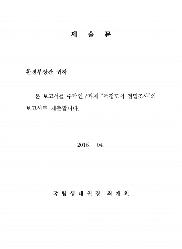 제 출 문 환경부장관 귀하 본 보고서를 수탁연구과제 “특정도서 정밀조사”의 보고서로 제출합니다. 2016. 04. 국 립 생 태 원 장 최 재천