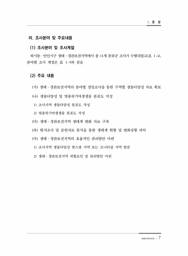 Ⅰ. 총 괄 www.nie.re.kr ? 7 라. 조사분야 및 주요내용 1 조사분야 및 조사계절 하시동·안인시구 생태·경관보전지역에서 총 11개 분류군 조사가 수행되었고 표 Ⅰ-4 , 분야별 조사 계절은 표 Ⅰ-5와 같음 2 주요 내용 가 생태·경관보전지역의 분야별 정밀조사를 통한 구역별 생물다양성 자료 확보 나 생물다양성 및 멸종위기야생생물 분포도 작성 1 조사지역 생물다양성 분포도 작성 2 멸종위기야생생물 분포도 작성 다 생태·경관보전지역 생태계 변화 자료 구축 라 현지조사 및 문헌자료 분석을 통한 생태계 현황 및 변화상황 파악 마 생태·경관보전지역의 효율적인 관리방안 마련 1 조사지역 생물다양성 핫스팟 지역 또는 모니터링 지역 발굴 2 생태·경관보전지역 위협요인 및 관리방안마련