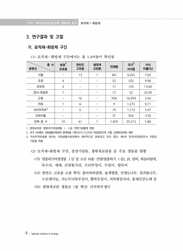 2017 백두대간보호지역 생태계 조사 묘적재 화방재 8 ? National Institute of Ecology 3. 연구결과 및 고찰 가. 묘적재화방재 구간 1 묘적재∼화방재 구간에서는 총 1,495종이 확인됨 종 수 분류군 법정1 보호종 한반도 고유종 생태계 교란종 전체종 서식종 국가2 비율 % 서식 식물 13 1 341 4,455 7.65 조류 4 52 522 9.96 포유류 4 17 125 13.60 양서·파충류 1 17 52 32.69 곤충 16 958 16,993 5.64 어류 1 6 9 1,272 0.71 저서무척추3 6 70 1,172 5.97 선태식물 31 924 3.35 전체 종 수 10 41 1 1,495 25,515 5.86 1. 법정보호종멸종위기야생생물 Ⅰ, Ⅱ급, 천연기념물에 한함 ...