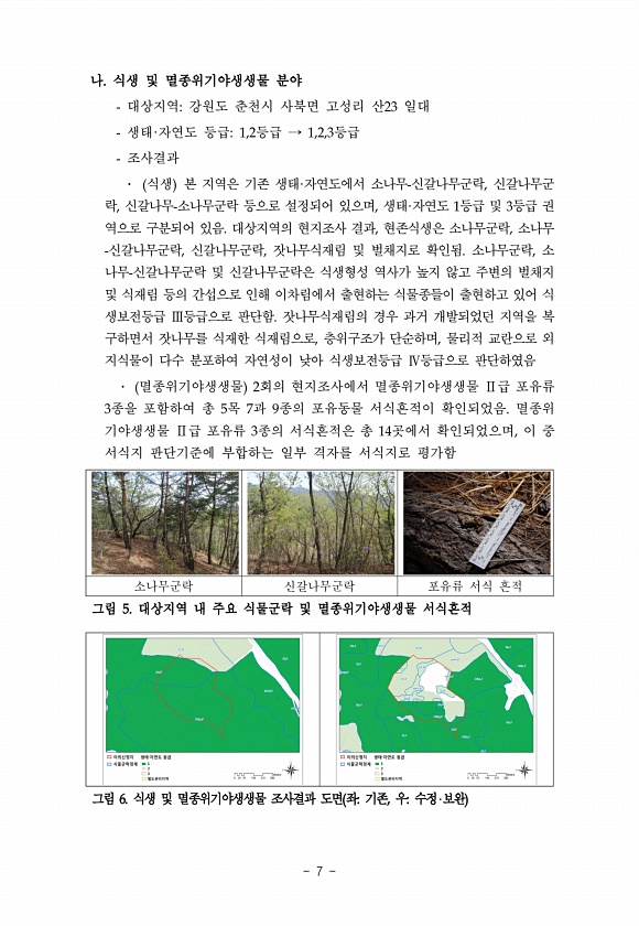 7 나. 식생 및 멸종위기야생생물 분야 대상지역강원도 춘천시 사북면 고성리 산23 일대 생태·자연도 등급1,2등급 → 1,2,3등급 조사결과 ? 식생 본 지역은 기존 생태·자연도에서 소나무-신갈나무군락, 신갈나무군 락, 신갈나무-소나무군락 등으로 설정되어 있으며, 생태·자연도 1등급 및 3등급 권 역으로 구분되어 있음. 대상지역의 현지조사 결과, 현존식생은 소나무군락, 소나무 -신갈나무군락, 신갈나무군락, 잣나무식재림 및 벌채지로 확인됨. 소나무군락, 소 나무-신갈나무군락 및 신갈나무군락은 식생형성 역사가 높지 않고 주변의 벌채지 및 식재림 등의 간섭으로 인해 이차림에서 출현하는 식물종들이 출현하고 있어 식 생보전등급 Ⅲ등급으로 판단함. 잣나무식재림의 경우 과거 개발되었던 지역을 복 구하면서 잣나무를 식재한...