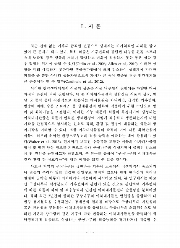 1 Ⅰ. 서 론 최근 전례 없는 기후의 급격한 변동으로 생태계는 비가역적인 피해를 받고 있어 큰 문제가 되고 있다. 특히 식물은 기후변화와 관련된 다양한 환경 스트레 스에 노출될 경우 생육의 저해가 발생하고 변화에 적응하지 못한 종은 심할 경 우 절멸의 위기에 놓일 수 있다 Gitlin et al., 2006; Allen et al., 2010 이러한 상 황을 미리 예측하지 못한다면 생물종다양성이 크게 감소하여 생태계에 막대한 피해를 줄 뿐만 아니라 생물자원으로서 가치가 큰 종이 멸종될 경우 인간에게도 큰 손실이라 할 수 있다 Cardinale et al., 2012 이러한 취약생태계에서 식물의 생존은 식물 내부에서 진행되는 다양한 대사 과정의 조절에 의해 진행된다. 이 중 이차대사물질의 생합성은 식물의 생...
