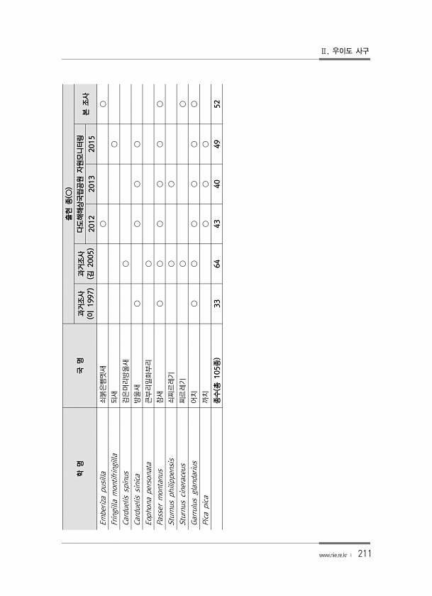 211 학 명 국 명 출현 종 ○ 과거조사 이 1997 과거조사 김 2005 다도해해상국립공원 자원모니터링 본 조사 2012 2013 2015 Emberiza pusilla 쇠붉은뺨멧새 ○ ○ Fringilla montifringilla 되새 ○ Carduelis spinus 검은머리방울새 ○ Carduelis sinica 방울새 ○ ○ ○ ○ Eophona personata 큰부리밀화부리 ○ Passer montanus 참새 ○ ○ ○ ○ ○ ○ Sturnus philippensis 쇠찌르레기 ○ ○ Sturnus cineraceus 찌르레기 ○ ○ Garrulus glandarius 어치 ○ ○ ○ ○ ○ ○ Pica pica 까치 ○ ○ ○ 종수 총 105종 33 64 43 40 4952