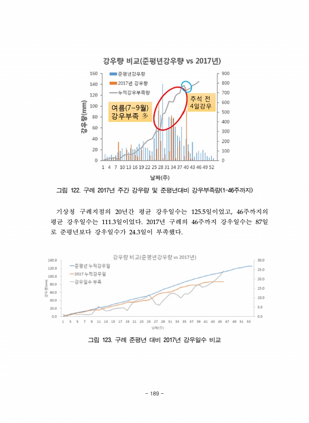 그림 122. 구례 2017년 주간 강우량 및 준평년대비 강우부족량 146주까지 기상청 구례지점의 20년간 평균 강우일수는 125.5일이었고, 46주까지의 평균 강우일수는 111.3일이었다. 2017년 구례의 46주까지 강우일수는 87일 로 준평년보다 강우일수가 24.3일이 부족했다. 그림 123. 구례 준평년 대비 2017년 강우일수 비교 189