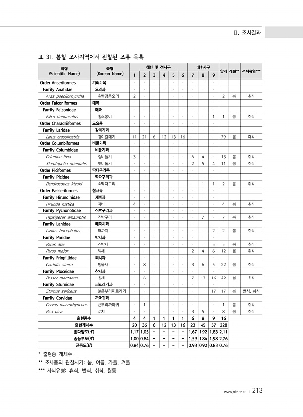 Ⅱ. 조사결과 www.nie.re.kr ? 213 표 31. 봄철 조사지역에서 관찰된 조류 목록 학명 Scientific Name 국명 Korean Name 해빈 및 전사구 배후사구 합계 계절** 서식유형*** 1 2 3 4 5 6 7 8 9 Order Anseriformes 기러기목 Family Anatidae 오리과 Anas poecilorhyncha 흰뺨검둥오리 2 2 봄 취식 Order Falconiformes 매목 Family Falconidae 매과 Falco tinnunculus 황조롱이 1 1 봄 취식 Order Charadriiformes 도요목 Family Laridae 갈매기과 Larus crassirostris 괭이갈매기 11 2...
