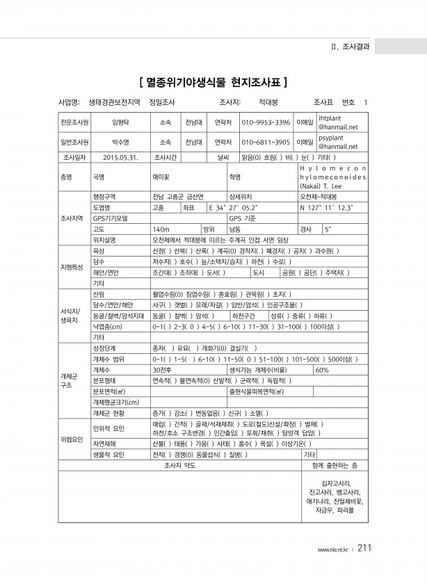 Ⅱ. 조사결과 www.nie.re.kr ? 211 [ 멸종위기야생식물 현지조사표 ] 전문조사원 임형탁 소속 전남대 연락처 010-9953-3396 이메일 ihtplant @hanmail.net 일반조사원 박수영 소속 전남대 연락처 010-6811-3905 이메일 psyplant @hanmail.net 조사일자 2015.05.31. 조사시간 날씨 맑음 0 흐림 비 눈 기타 종명 국명 매미꽃 학명 H y l o m e c o n h y l o m e c o n o i d e s Nakai T. Lee 조사지역 행정구역 전남 고흥군 금산면 상세위치 오천제-적대봉 도엽명 고흥 좌표 E 34°27′05.2″ N 127°11′12.3″ GPS기기모델 GPS 기준 고도 140m 방위 남동 경사 5° 위치설명 오천제에서 ...