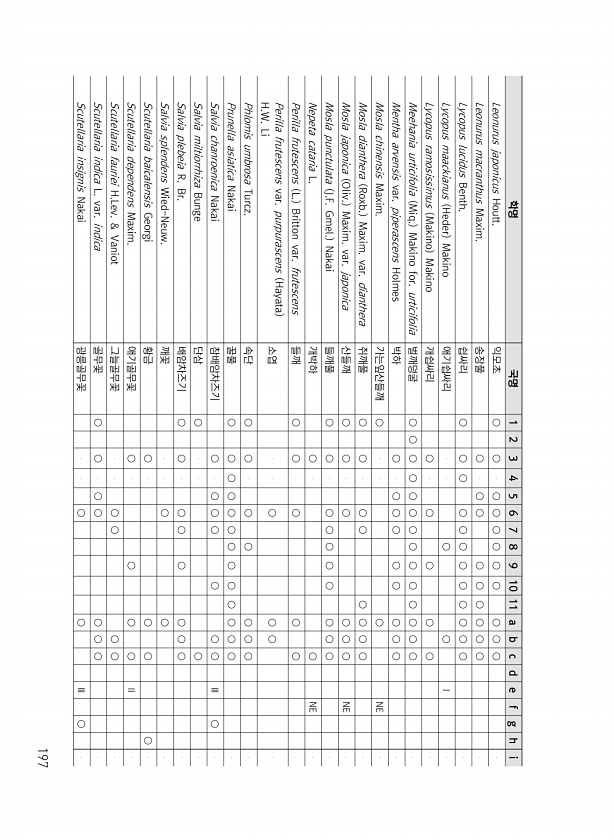 197 학명 국명 1 2 3 4 5 6 7 8 9 10 11 a b c d e f g h i Leonurus japonicus Houtt. 익모초 ○ ○ ○ ○ ○ ○ ○ ○ ○ ○ ○ Leonurus macranthus Maxim. 송장풀 ○ ○ ○ ○ ○ ○ ○ ○ ○ Lycopus lucidus Benth. 쉽싸리 ○ ○ ○ ○ ○ ○ ○ ○ ○ ○ ○ ○ Lycopus maackianus Heder Makino 애기쉽싸리 ○ ○ Ⅰ Lycopus ramosissimus Makino Makino 개쉽싸리 ○ ○ ○ ○ ○ Meehania urticifolia Miq. Makino for. urticifolia 벌깨덩굴 ○ ○ ○ ○ ○ ○ ○ ○ ○ ○ ○ ○ ○ ○ Mentha arvensis var...