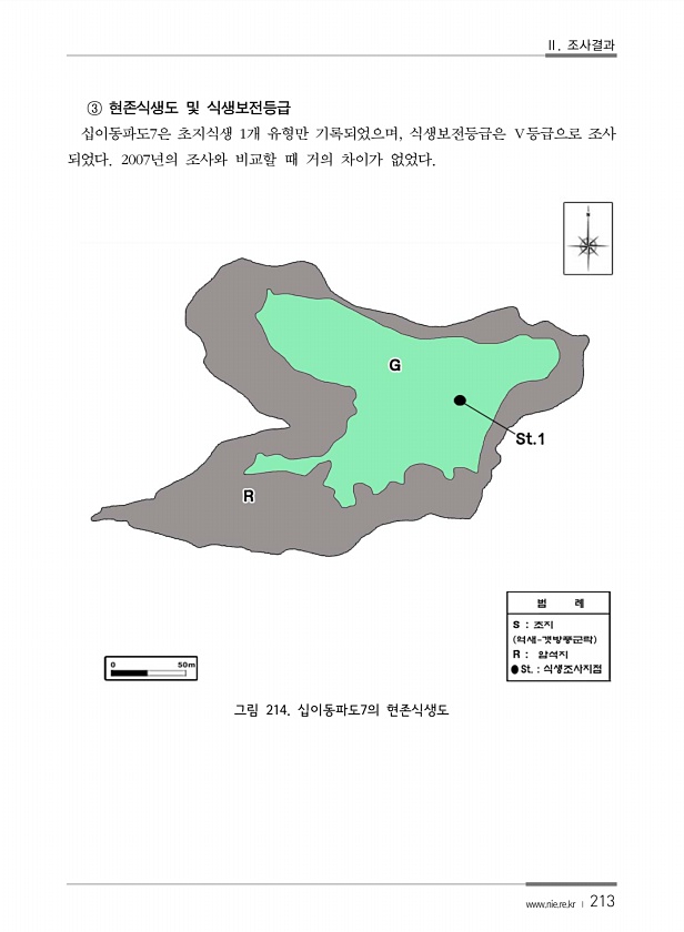 Ⅱ. 조사결과 www.nie.re.kr ? 213 ③ 현존식생도 및 식생보전등급 십이동파도7은 초지식생 1개 유형만 기록되었으며, 식생보전등급은 Ⅴ등급으로 조사 되었다. 2007년의 조사와 비교할 때 거의 차이가 없었다. 그림 214. 십이동파도7의현존식생도