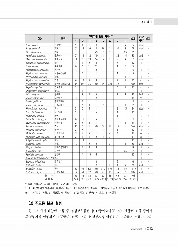Ⅱ. 조사결과 www.nie.re.kr ? 213 학명 국명 조사지점 관찰 개체수※ 합계 관찰 1 2 3 4 5 6 7 8 시기* 비고° Parus varius 곤줄박이 5 4 2 9 3 4 27 abcd Parus palustris 쇠박새 7 26 19 8 16 7 10 5 98 abcd Hirundo rustica 제비 45 2 3 25 75 bd Aegithalos caudatus 오목눈이 7 11 12 10 3 22 15 80 acd Microscelis amaurotis 직박구리 14 26 13 14 6 3 9 4 89 abcd Urosphena squameiceps 숲새 1 1 3 4 3 12 a Cettia diphone 휘파람새 6 6 11 11 1 2 37 ab Ac...