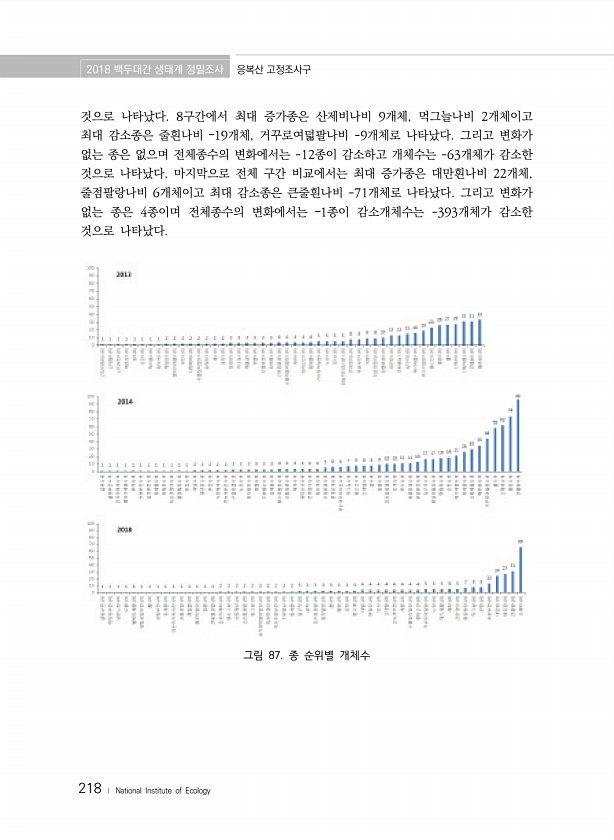 2018 백두대간 생태계 정밀조사 응복산 고정조사구 218 ? National Institute of Ecology 것으로 나타났다. 8구간에서 최대 증가종은 산제비나비 9개체, 먹그늘나비 2개체이고 최대 감소종은 줄흰나비 ?19개체, 거꾸로여덟팔나비 -9개체로 나타났다. 그리고 변화가 없는 종은 없으며 전체종수의 변화에서는 -12종이 감소하고 개체수는 -63개체가 감소한 것으로 나타났다. 마지막으로 전체 구간 비교에서는 최대 증가종은 대만흰나비 22개체, 줄점팔랑나비 6개체이고 최대 감소종은 큰줄흰나비 -71개체로 나타났다. 그리고 변화가 없는 종은 4종이며 전체종수의 변화에서는 ?1종이 감소개체수는 -393개체가 감소한 것으로 나타났다. 그림 87. 종 순위별개체수