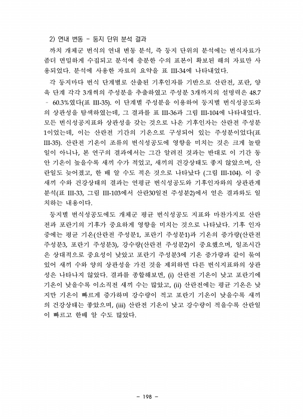 198 2 연내 변동 둥지 단위 분석 결과 까치 개체군 번식의 연내 변동 분석, 즉 둥지 단위의 분석에는 번식자료가 좀더 면밀하게 수집되고 분석에 충분한 수의 표본이 확보된 해의 자료만 사 용되었다. 분석에 사용한 자료의 요약을 표 III-34에 나타내었다. 각 둥지마다 번식 단계별로 산출된 기후인자를 기반으로 산란전, 포란, 양 육 단계 각각 3개씩의 주성분을 추출하였고 주성분 3개까지의 설명력은 48.7 ? 60.3%였다 표 III-35 이 단계별 주성분을 이용하여 둥지별 번식성공도와 의 상관성을 탐색하였는데, 그 결과를 표 III-36과 그림 III-104에 나타내었다. 모든 번식성공지표와 상관성을 갖는 것으로 나온 기후인자는 산란전 주성분 1이었는데, 이는 산란전 기간의 기온으로 구성되어 있는 주성분...