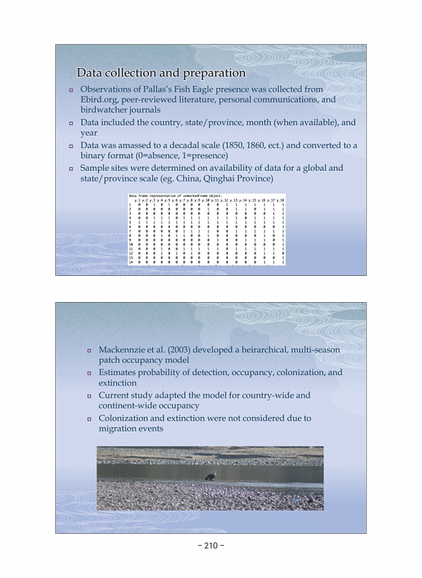 ? Mackennzie et al. 2003 developed a heirarchical, multi-season patch occupancy model ? Estimates probability of detection, occupancy, colonization, and extinction ? Current study adapted the model for country-wide and continent-wide occupancy ? Colonization and extinction were not considered due to migration events Data collection and preparation ? Observations of Pallas’s Fish Eagle presence was...