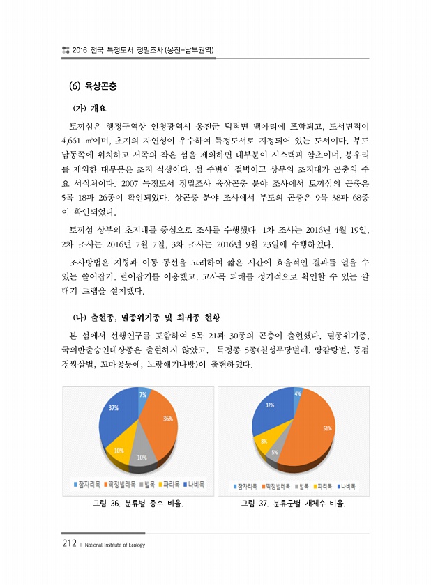 2016 전국 특정도서 정밀조사 옹진-남부권역 212 ? National Institute of Ecology 6 육상곤충 가 개요 토끼섬은 행정구역상 인청광역시 옹진군 덕적면 백아리에 포함되고, 도서면적이 4,661 ㎡이며, 초지의 자연성이 우수하여 특정도서로 지정되어 있는 도서이다. 부도 남동쪽에 위치하고 서쪽의 작은 섬을 제외하면 대부분이 시스택과 암초이며, 봉우리 를 제외한 대부분은 초지 식생이다. 섬 주변이 절벽이고 상부의 초지대가 곤충의 주 요 서식처이다. 2007 특정도서 정밀조사 육상곤충 분야 조사에서 토끼섬의 곤충은 5목 18과 26종이 확인되었다. 상곤충 분야 조사에서 부도의 곤충은 9목 38과 68종 이 확인되었다. 토끼섬 상부의 초지대를 중심으로 조사를 수행했다. 1차 조사는 2016년...