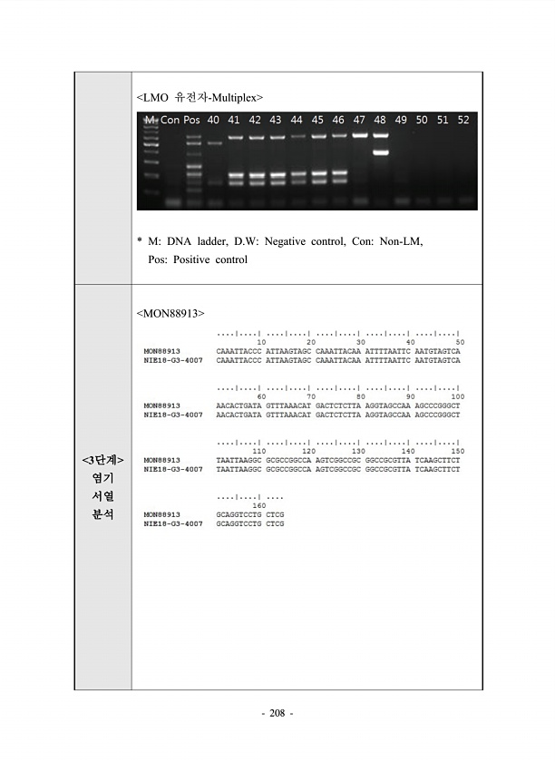 208 LMO 유전자-Multiplex * MDNA ladder, D.WNegative control, ConNon-LM, PosPositive control 3단계 염기 서열 분석 MON88913
