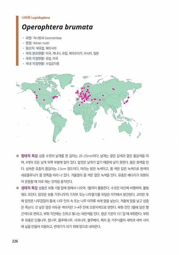 226 ● 형태적 특징 성충 수컷의 날개를 편 길이는 20-25mm이다. 날개는 옅은 갈색과 옅은 황갈색을 띠 며, 4개의 모든 날개 뒤쪽 부분에 털이 있다. 암컷은 날개가 없기 때문에 날지 못한다. 몸은 회색을 띤 다. 성숙한 유충의 몸길이는 2.5cm 정도이다. 머리는 밝은 녹색이고, 몸 색은 짙은 녹색으로 흰색의 세로줄무늬가 몸 양쪽을 따라 나 있다. 겨울철의 몸 색은 옅은 녹색을 띤다. 유충은 배다리가 퇴화되 어 운동할 때 자로 재는 것처럼 움직인다. ● 생태적 특징 성충은 보통 11월 말에 땅에서 나오며, 1월까지 활동한다. 수컷은 야간에 비행하며, 불빛 에도 모인다. 암컷은 보통 기주나무의 기저부 또는 나무줄기를 뒤덮은 이끼에서 발견된다. 교미한 후 에 암컷은 나무껍질의 틈새, 나무 인피 속 또는...