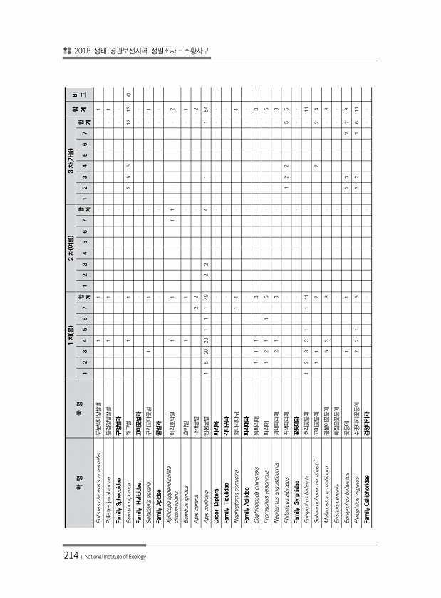 214 학 명 국 명 1 차 봄 2 차 여름 3 차 가을 합 계 비 고 1 2 3 4 5 6 7 합 계 1 2 3 4 5 6 7 합 계 1 2 3 4 5 6 7 합 계 Polistes chinensis antennalis 두눈박이쌍살벌 1 1 1 Polistes jokahamae 등검정쌍살벌 1 1 1 Family Sphecoidae 구멍벌과 Bembix niponica 왜코벌 1 1 2 5 5 12 13 ◎ Family Halicidae 꼬마꽃벌과 Seladonia aeraria 구리꼬마꽃벌 1 1 1 Family Apidae 꿀벌과 Xylocopa appendiculata circumvolans 어리호박벌 1 1 1 1 2 Bombus ignitus 호박벌 1 1 1 ...