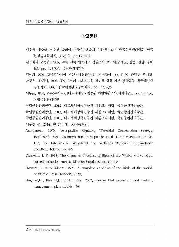 2016 전국 해안사구 정밀조사 214 ? National Institute of Ecology 참고문헌 김우열, 배소연, 오수정, 윤희남, 이중효, 백운기, 성하철. 2016. 한국환경생태학회, 한국 환경생태학회지. 30권2호, pp.155-164 김창회와 강종현. 2005. 2005 전국 해안사구 정밀조사 보고서 구례포, 삼봉, 신합, 우이 도 pp. 495-509. 국립환경과학원 김창회. 2001. 조류조사지침. 제2차 자연환경 전국기초조사. pp. 45-59. 환경부. 경기도. 남정호·강대석, 2005. 무인도서의 지속가능한 관리를 위한 기본 정책방향. 한국해양환 경공학회. 8 4 한국해양환경공학회지. pp. 227-235 이두표. 1997. 조류 우이도 [다도해해상국립공원 자연자원조사 서해지구 ]....