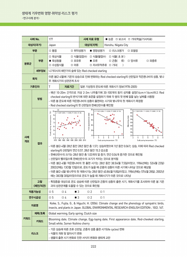 222 생태계 기후변화 영향·취약성·리스크 평가 -연구사례 분석- 사례 No. 177 사례 자료 유형 ■ 논문 □ 보고서 □ 기타 학술/기사자료 대상지 국가 Japan 대상지 지역 Honshu, Niigata City 부문 □ 통합 □ 취약성평가 ■ 영향성평가 □ 리스크평가 □ 모델링 분류군 부문 □ 육상식물 □ 식물 침엽수 □ 식물 활엽수 □ 식물 초 본 ■ 육상동물 □ 포유류 ■ 조류 □ 곤충 류 □ 양서류 □ 파충류 □ 수상동식물 □ 어류 □ 저서무척추류 □ 기타 세부정보 니기타시의 해안가의 숲에 있는 Red checked starling 목적 이른 봄 2-4월 에 기온의 상승으로 인해 변화하는 Red checked starling의 산란일과 작은흰나비의 성충, 벚나 무 개화시기의 상관관계 조사 기후인...