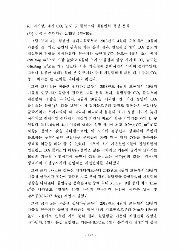 177 6 미기상, 대기 CO2 농도 및 플럭스의 계절변화 특성 분석 가 점봉산 생태타워 2018년 4월10월 그림 93의 a는 점봉산 생태타워로부터 2018년도 4월의 초봄에서 10월의 가을철 연구기간 동안에 관측된 자료 분석 결과, 월별평균 대기 CO2 농도의 계절변화 경향을 제시하였다. 연구기간 동안에 CO2 농도는 4월의 초기 봄에 698.9mg m-3으로 가장 높았고 6월의 초기 여름철의 성장 시기에 CO2 농도는 646.8mg m-3으로 가장 낮았다. 이후, 가을철에 들어서면서 서서히 증가하였다. 그러나 점봉산 생태타워의 본 연구기간 중에 계절변화에 따른 대기 중의 CO2 농도 차이는 큰 편차를 나타내지 않았다. 그림 93의 b는 점봉산 생태타워로부터 2018년도 4월의 초봄에서 10월의 가을철 ...