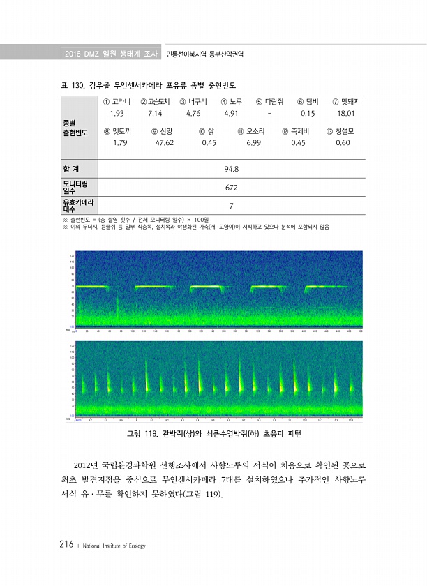 2016 DMZ 일원 생태계 조사 민통선이북지역 동부산악권역 216 ? National Institute of Ecology 종별 출현빈도 ① 고라니 ② 고슴도치 ③ 너구리 ④ 노루 ⑤ 다람쥐 ⑥ 담비 ⑦ 멧돼지 1.93 7.14 4.76 4.91 0.15 18.01 ⑧ 멧토끼 ⑨ 산양 ⑩ 삵 ⑪ 오소리 ⑫ 족제비 ⑬ 청설모 1.79 47.62 0.45 6.99 0.45 0.60 합 계 94.8 모니터링 일수 672 유효카메라 대수 7 ※ 출현빈도 = 총 촬영 횟수 전체 모니터링 일수 × 100일 ※ 이외 두더지, 등줄쥐 등 일부 식충목, 설치목과 야생화된 가축 개, 고양이 이 서식하고 있으나 분석에 포함되지 않음 표 130. 감우골 무인센서카메라 포유류 종별 출현빈도 그림 118. 관박쥐 상 와 쇠큰수염박...