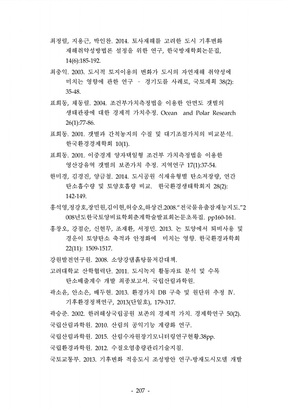 최정렬 지용근 박인찬 토사재해를 고려한 도시 기후변화 재해취약성방법론 설정을 위한 연구 한국방재학회논문집 최충익 도시적 토지이용의 변화가 도시의 자연재해 취약성에 미치는 영향에 관한 연구 경기도를 사례로 국토계획 표희동 채동렬 조건부가치측정법을 이용한 안면도 갯벌의 생태관광에 대한 경제적 가치추정 표희동 갯벌과 간척농지의 수질 및 대기조절가치의 비교분석 한국환경경제학회 표희동 이중경계 양자택일형 조건부 가치측정법을 이용한 영산강유역 갯벌의 보존가치 추정 지역연구 한미경 김경진 양금철 도시공원 식재유형별 탄소저장량 연간 탄소흡수량 및 토양호흡량 비교 한국환경생태학회지 홍석영 정강호 장민원 김이현 허승오 하상건 전국물유출잠재능지도 년도한국토양비료학회춘계학술발표회논문초록집 홍창오 강점순 신현무 조재환 서정민 논 ...