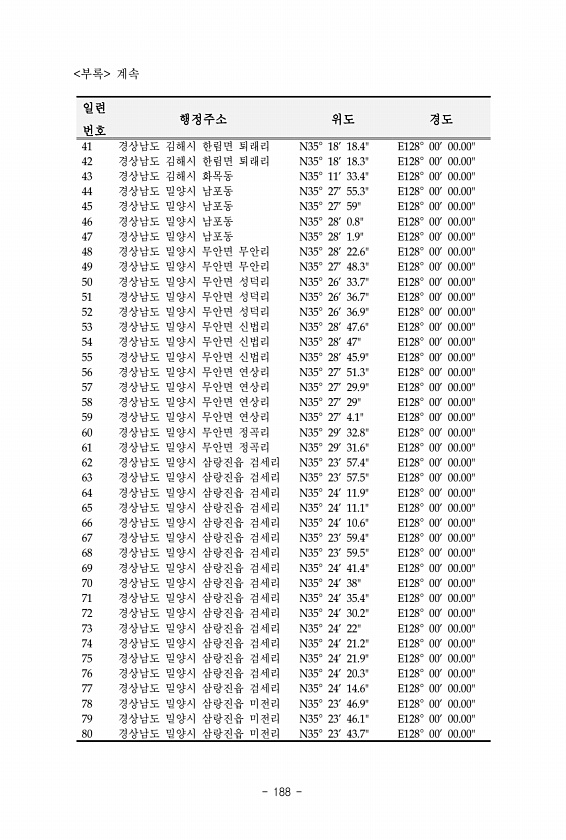 부록 계속 일련 번호 행정주소 위도 경도 41 경상남도 김해시 한림면 퇴래리 N35° 1818.4E128° 0000.0042 경상남도 김해시 한림면 퇴래리 N35° 1818.3E128° 0000.0043 경상남도 김해시 화목동 N35° 1133.4E128° 0000.0044 경상남도 밀양시 남포동 N35° 2755.3E128° 0000.0045 경상남도 밀양시 남포동 N35° 2759E128° 0000.0046 경상남도 밀양시 남포동 N35° 280.8E128° 0000.0047 경상남도 밀양시 남포동 N35° 281.9E128° 0000.0048 경상남도 밀양시 무안면 무안리 N35° 2822.6E128° 0000.0049 경상남도 밀양시 무안면 무안리 N35° 2748.3E128° 0000.0050 경상...