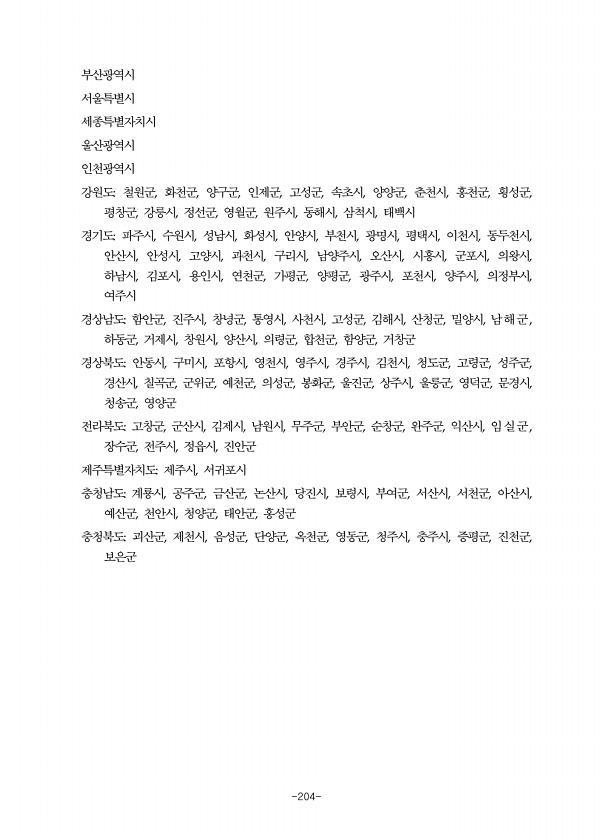 -204- 부산광역시 서울특별시 세종특별자치시 울산광역시 인천광역시 강원도 철원군 화천군 양구군 인제군 고성군 속초시 양양군 춘천시 홍천군 횡성군 평창군 강릉시 정선군 영월군 원주시 동해시 삼척시 태백시 경기도 파주시 수원시 성남시 화성시 안양시 부천시 광명시 평택시 이천시 동두천시 안산시 안성시 고양시 과천시 구리시 남양주시 오산시 시흥시 군포시 의왕시 하남시 김포시 용인시 연쳔군 가평군 양평군 광주시 포천시 양주시 의정부시 여주시 경상남도 함안군 진주시 창녕군 통영시 사천시 고성군 김해시 산청군 밀양시 남해군 하동군 거제시 창원시 양산시 의령군 합천군 함양군 거창군 경상북도 안동시 구미시 포항시 영천시 영주시 경주시 김천시 청도군 고령군 성주군 경산시 칠곡군 군위군 예천군 의성군 봉화군 울진군 상주시 울...