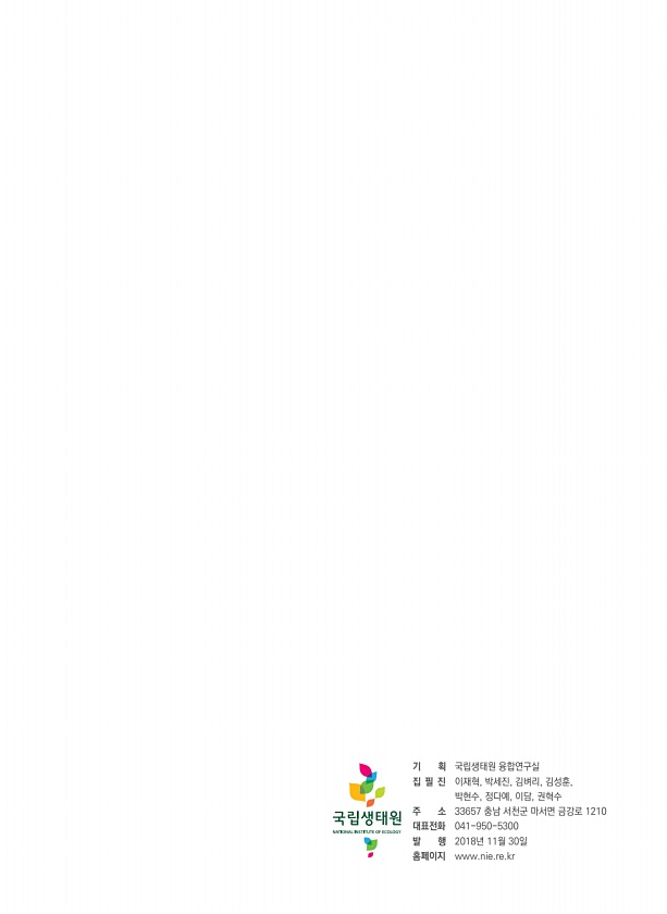 기 획 국립생태원 융합연구실 집 필 진 이재혁, 박세진, 김벼리, 김성훈, 박현수, 정다예, 이담, 권혁수 주 소 33657 충남 서천군 마서면 금강로 1210 대표전화 041-950-5300 발 행 2018년 11월 30일 홈페이지www.nie.re.kr